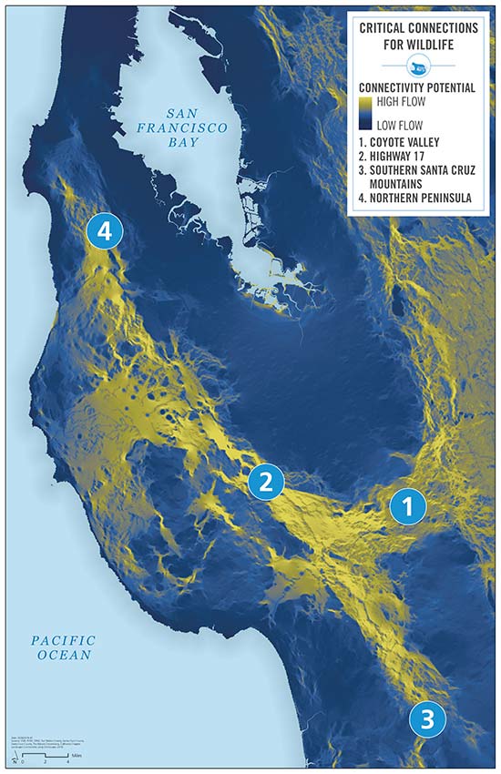 This map shows a perspective of existing habitat connectivity on the Peninsula and in the South Bay. It is among the many tools we use to identify and prioritize areas for conservation. The brighter colors highlight areas where the flow between regions is constricted by surrounding land uses.